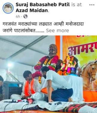 सहकार मंत्री बाबासाहेब पाटील यांचा मुलगा सुरज पाटील यांनी मनोज जरांगे यांच्या आंदोलनाला पाठिंबा देत असल्याची पोष्ट करत चलो मुंबईचा नारा दिला होता. आता मनोज जरांगे यांची आझाद मैदानावर भेट घेतल्याचा फोटो टाकत "गरजवंत मराठ्यांच्या लढ्यात आम्ही मनोजदादा जरांगेसोबत" असा उल्लेख केला आहे.